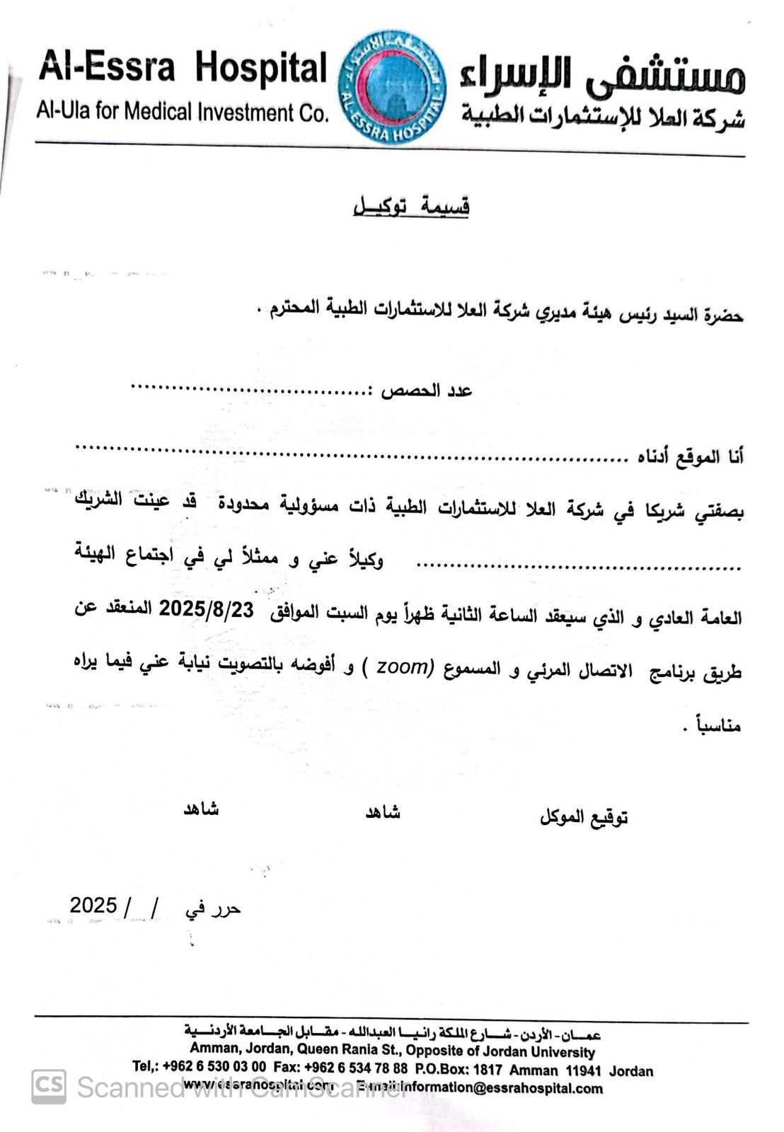 دعوة اجتماع هيئة عامة عادي لشركة العلا للاستثمارات الطبية ذات المسؤولية المحدودة (مستشفى الاسراء) المنعقدة يوم السبت الموافق 23/8/2025